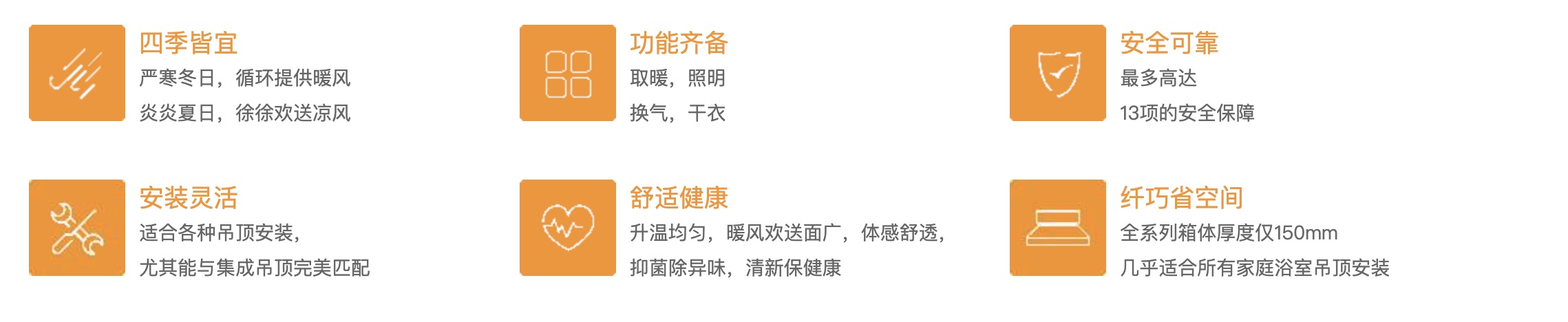 全系列采用優(yōu)質(zhì)PTC發(fā)熱元件,熱效率高,迅速提升浴室溫度